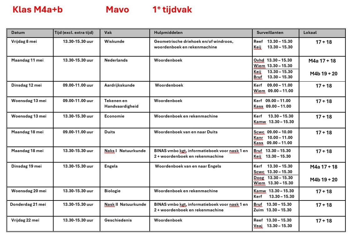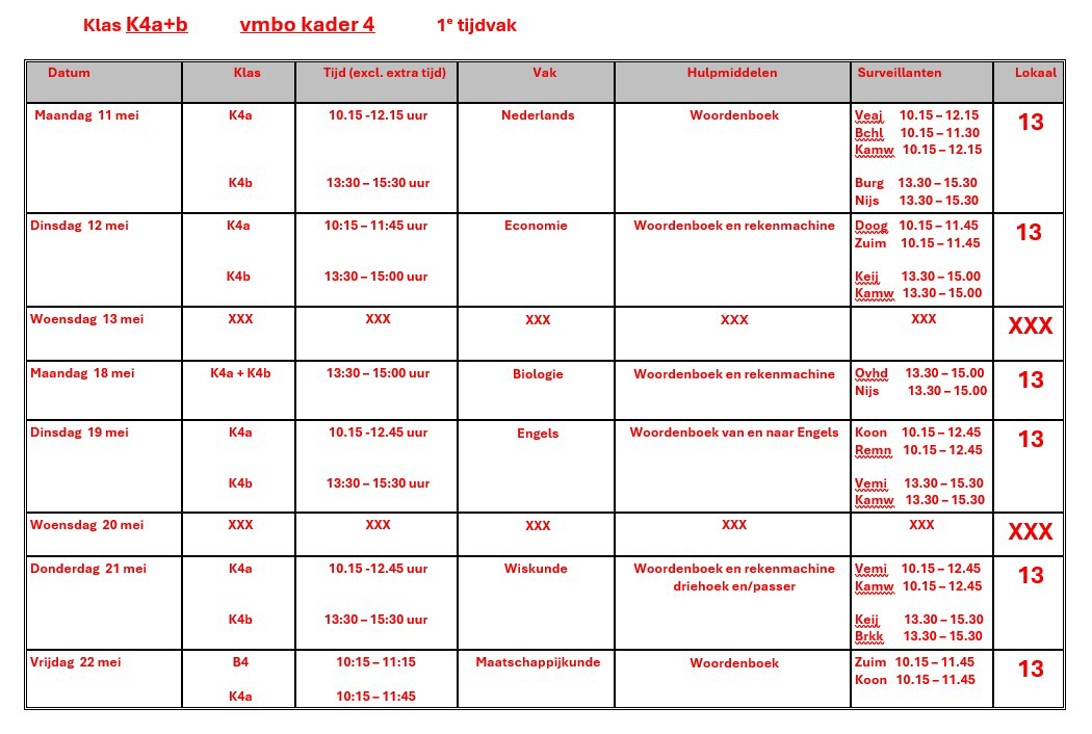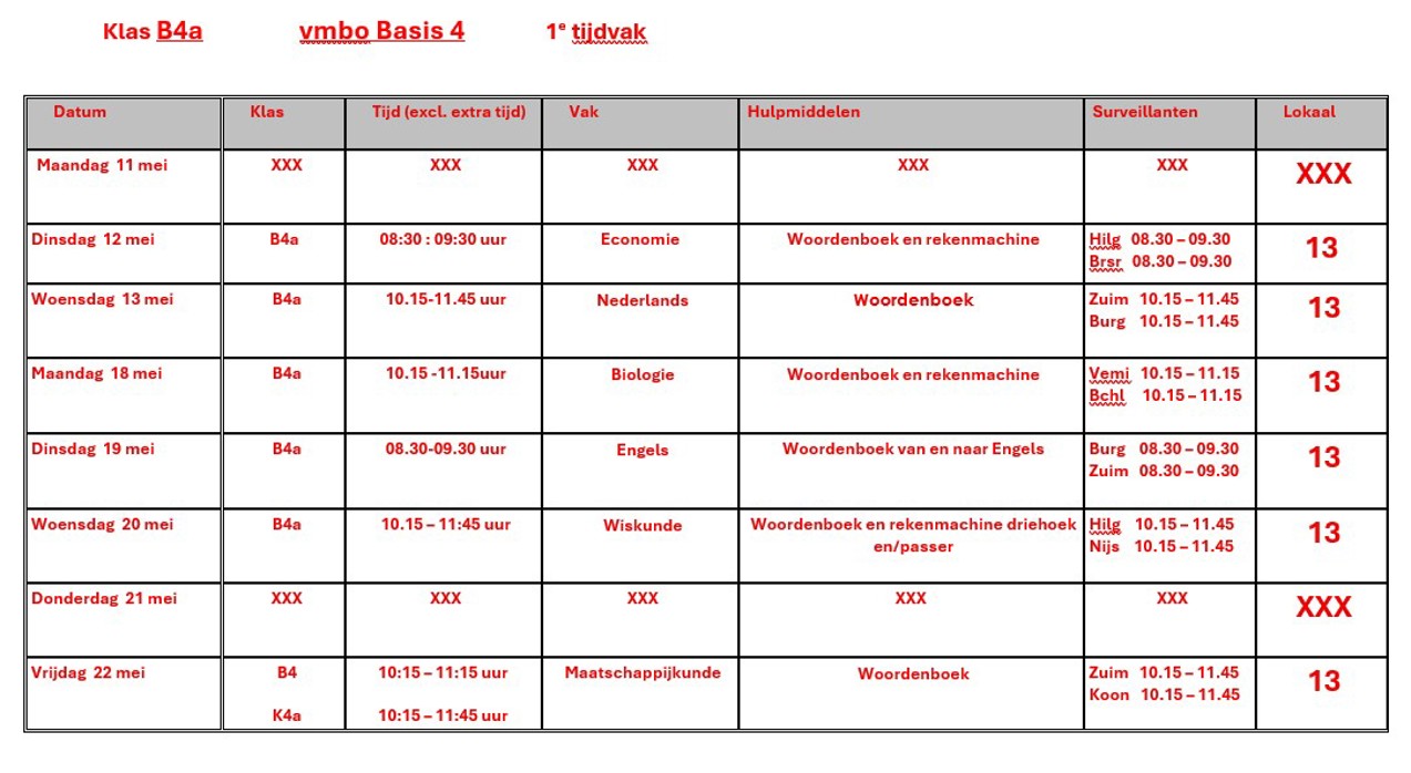 | klas | uur | vak | docent | vak | docent | lokaal | opmerking |